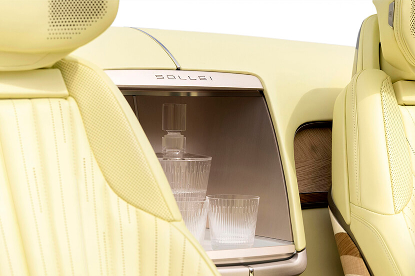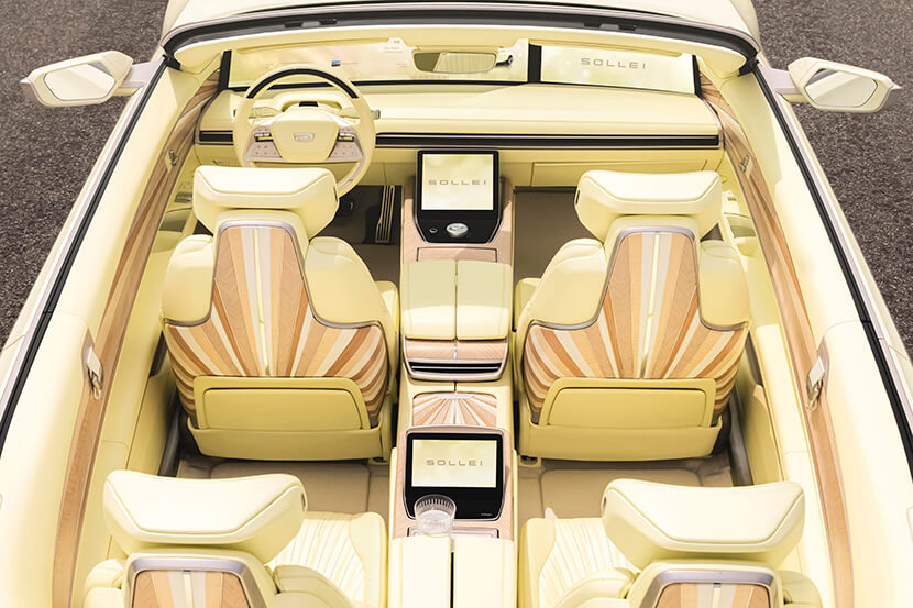 Несмотря на внешнее сходство с лифтбеком Celestiq, а также ряд общих конструктивных особенностей, включая передние стояки и 55-дюймовый цифровой кластер на передней панели, кабриолет Sollei окрашен в особый оттенок Manila Cream, повторяющий цветовую гамму винтажных автомобилей Cadillac 1950-ых годов.