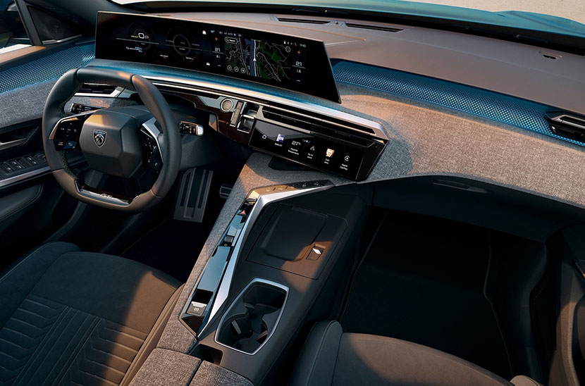 Главным элементом интерьера, как было сказано выше, станет изогнутый дисплей диагональю 21 дюйм. Благодаря скрытому креплению и подсветке в нижней части будет казаться, что экран парит в воздухе. В соответствии с новой фирменной архитектурой Panoramic i-Cockpit эффект продублируют и на руле, визуально «отвязав» центральную его часть от спиц.