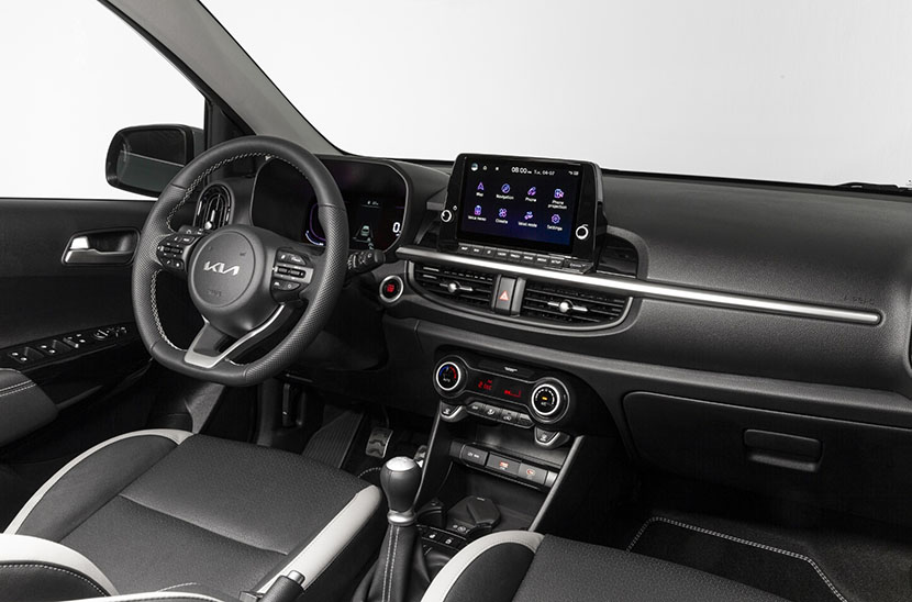 В салоне Picanto доминируют 8-дюймовый центральный дисплей и цифровая приборная панель. Медиасистема поддерживает Apple CarPlay и Android Auto, а также одновременное подключение двух смартфонов по Bluetooth. Сервис Kia Connect информирует пользователя о пробках, погоде и предлагает услуги онлайн-навигации, которая для построения оптимального маршрута использует ретроспективные данные из облака.