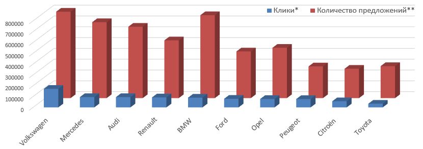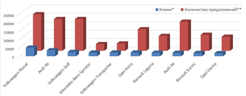 Что мы видим в этой статистике? Тройка лидеров совпадает у продавцов и у покупателей, причем предложение снова значительно опережает спрос. А вот практичные и большие Mercedes-Benz Sprinter и Volkswagen Transporter на четвертом и пятом местах – только у покупателей. У продавцов они не так популярны и оказались бы, скорее всего, даже не в этом топ-10. И напрасно, ведь люди активно ищут к ним запчасти (причем обратите внимание, что количество кликов на объявления о продаже запчастей на Sprinter и Transporter практически совпадает).