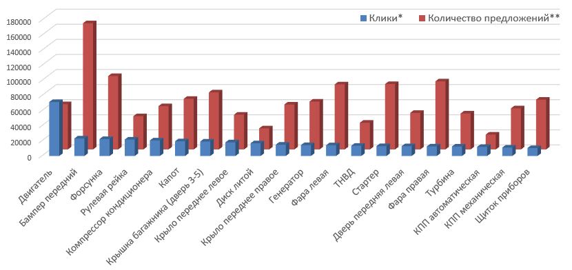 ТОП-20 востребованных у покупателей запчастей и количество предложений продавцов