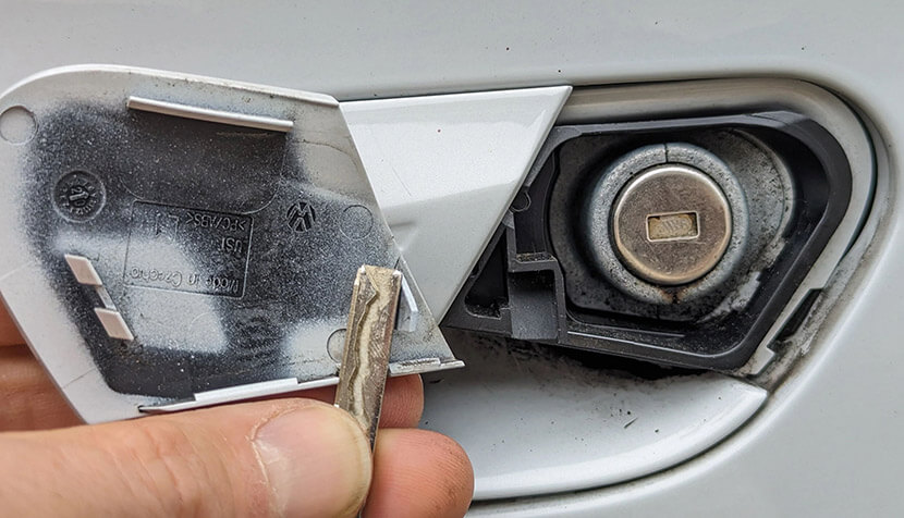 На случай разрядки АКБ 12В в брелоке спрятан физический ключ. Обычно есть маленькая кнопка или ползунок, чтобы его вытащить. Этим ключом можно открыть водительскую дверь: замочная скважина скрыта под декоративной пластиковой крышкой на ручке двери, нужно просто поддеть ее плоским предметом.