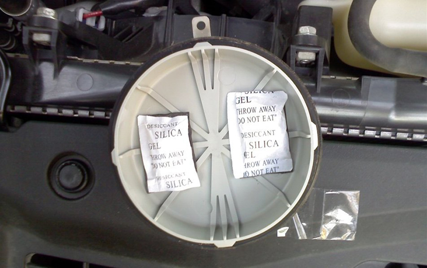 Некоторые производители на стадии конвейерной сборки применяют абсорбирующее вещество в виде пакетиков с гранулами силикагеля. Оно поглощает влагу, не давая ей оседать на обтекателе. Время жизни этого крошечного мешочка с абсорбентом ограничено лишь сроком службы самой фары. Такое приспособление нетрудно сделать самому, положив или закрепив в корпусе фары гранулы вещества в какой-нибудь дышащей емкости.