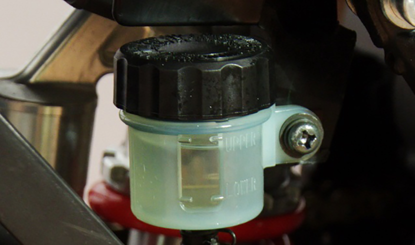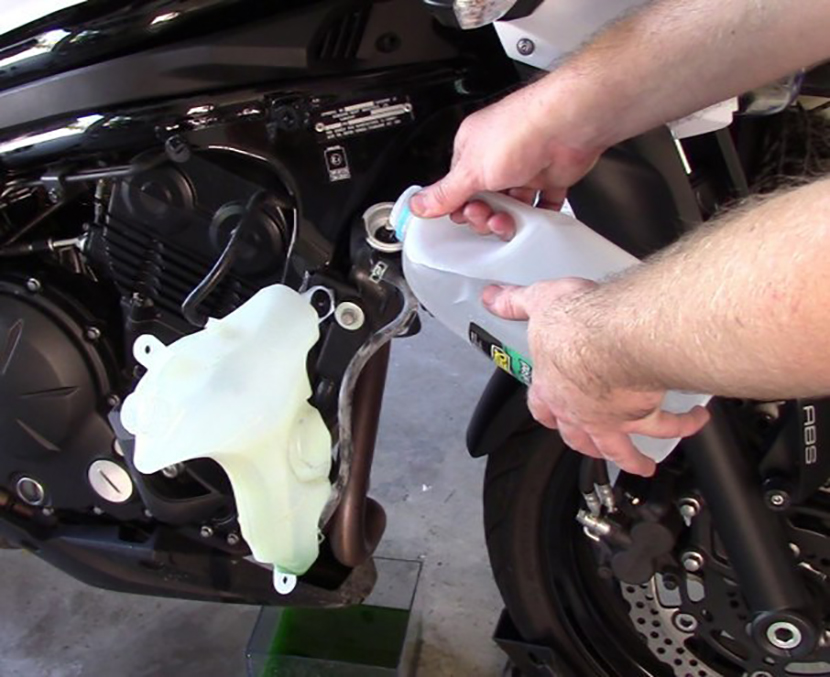 Затем необходимо проконтролировать уровень охлаждающей жидкости. Сделать это несложно, достаточно поставить мотоцикл вертикально и посмотреть на расширительный бачок, на котором специально для этого нанесены риски. Если уровень жидкости минимален, ее нужно долить. О важности применения в системе антифриза одного вида мы тоже рассказывали. Поэтому используем охлаждающую жидкость одной и той же марки или хотя бы того же цвета. Если она помутнела, лучше полностью заменить «охлаждайку», предварительно слив отработанную и промыв систему.