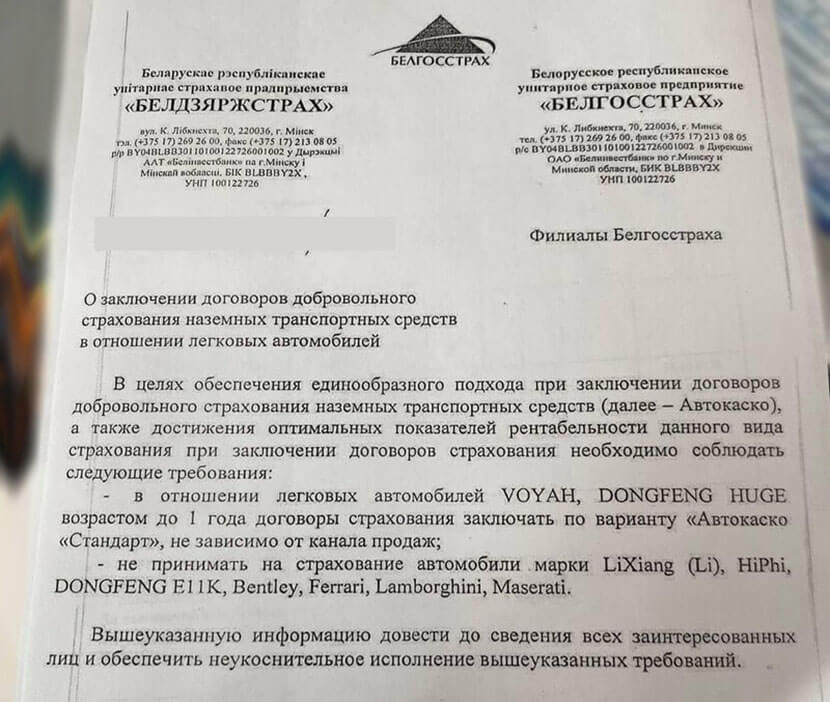 Так, в начале минувшей осени один из крупнейших страховщиков страны, компания Белгосстрах, разослала всем своим филиалам любопытное предписание, согласно которому добровольное страхование автомобилей таких марок, как Bentley, Dongfeng E11K, HiPhi, Ferrari, Lamborghini, LiXiang и Maserati, временно приостановлено. Тогда как в отношении легковушек Voyan, Dongfeng и Huge возрастом до 1 года договоры страхования впредь должны заключаться по варианту «Автокаско «Стандарт», вне зависимости от канала продаж.