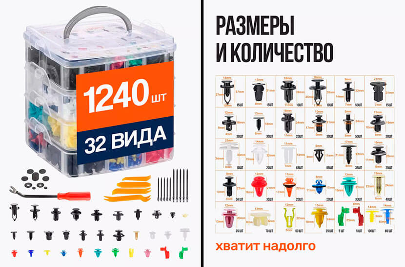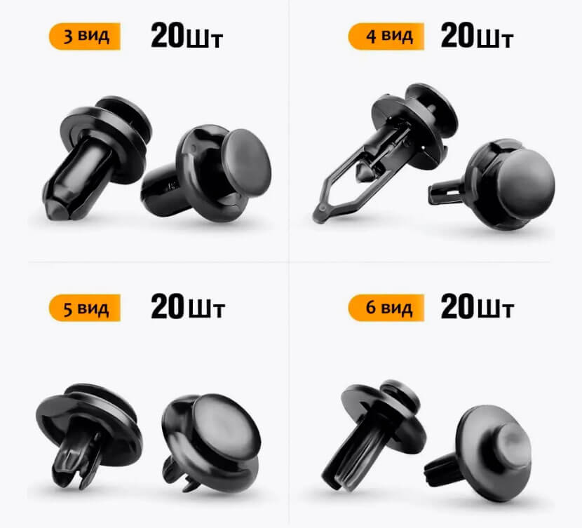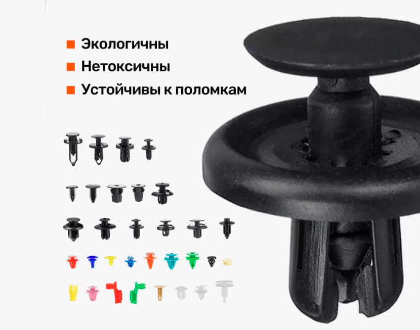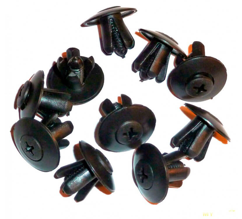 Важно знать, что разнообразие клипс насчитывает более трех десятков видов: они различаются между собой как по размеру (от 5 до 35 мм), так и по форме, имея различные шляпки и посадочные штыри, соответствующие различным типам гнезд. По сути, это одноразовый крепеж, которые не подлежит вторичному использованию — во всяком случае, производитель говорит именно так.