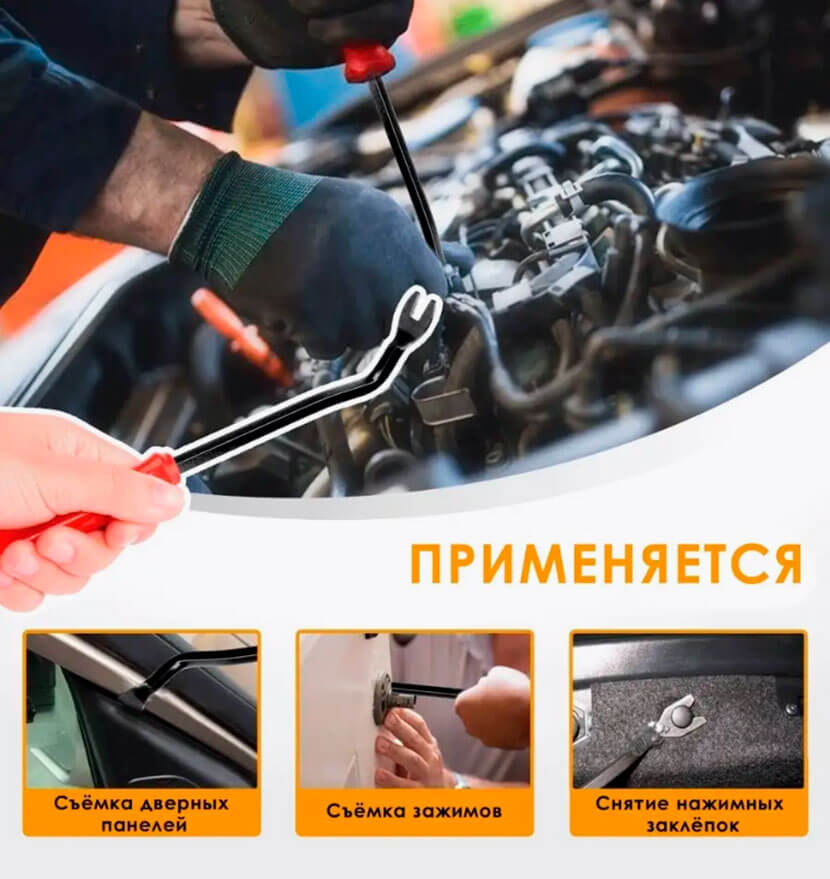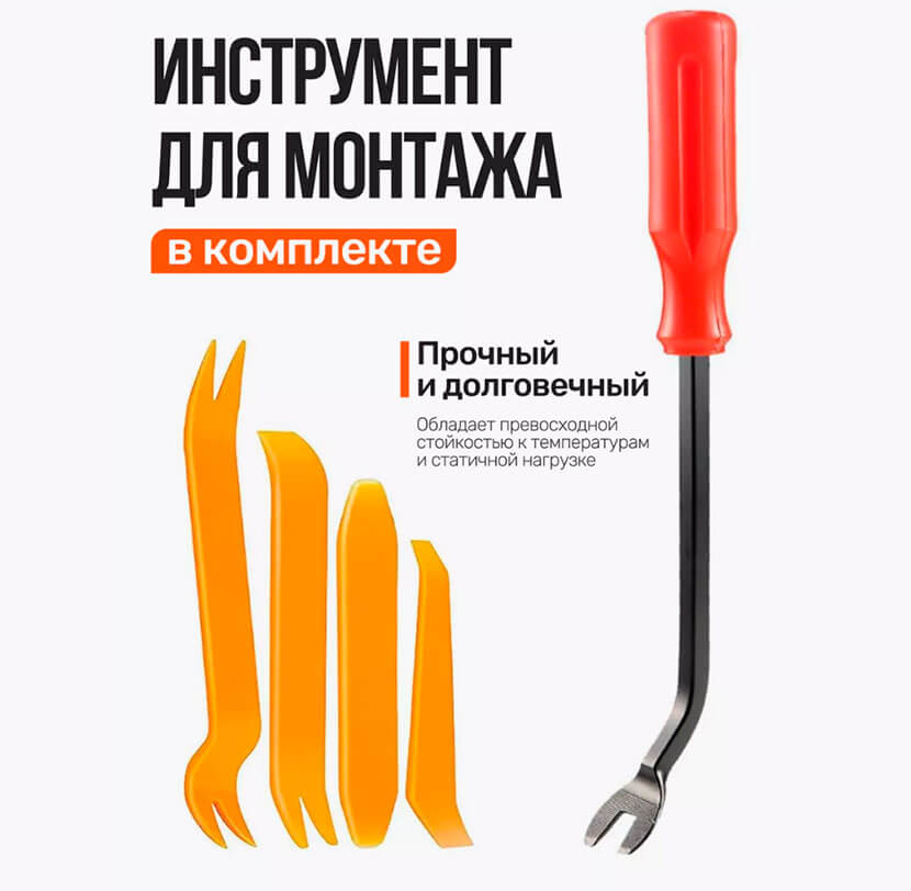 Заранее приобретите инструменты для извлечения различных видов клипс. Обычно они продаются в наборе и достаточно универсальны: пластиковыми лопатками вы можете без последствий подцеплять края декоративных накладок и панелей, а при помощи съемника — особого ключа с искривленной головкой — можно легко снять дверные панели, демонтировать зажимы и нажимные кнопки.