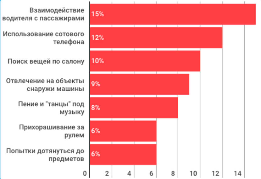 Практика показывает, что попытка набрать телефонный номер руками, а не через голосового помощника, а также решение поправить макияж увеличивают вероятность ДТП втрое. Выезд на дорогу водителя-лунатика, то есть человека с накопленной усталостью, способного в любой момент провалиться в микросон, может спровоцировать аварию с четырехкратной вероятностью.