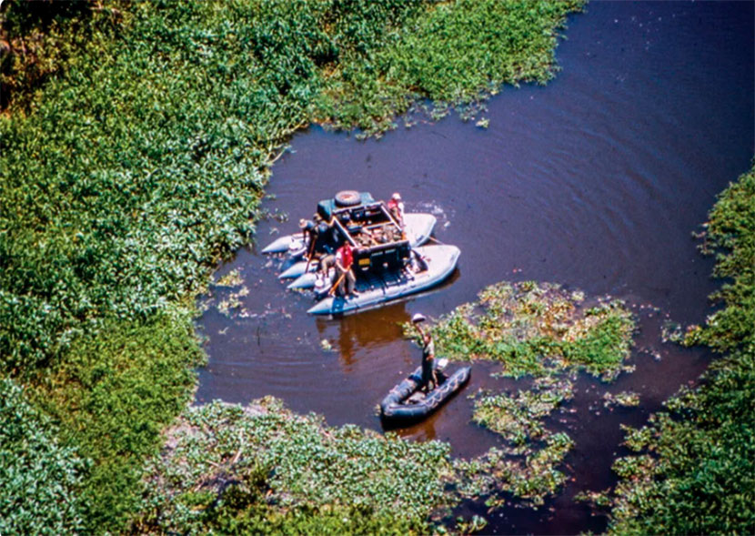 Форсировать ее на внедорожниках больше не было никакой возможности, поэтому путешественники пробирались в плавь, построив для машин понтонные площадки из нескольких рафтов, надувных плотов, связанных между собой. При этом течение реки бывало настолько сильно, что могло запросто опрокинуть нагруженное рукотворное судно, что регулярно и случалось. Одно из таких происшествий унесло жизни сразу пятых кубинских военных. Другое – едва не потопило плот с одним из Range Rover, заставив мотор авто наглотаться воды. Любопытно, что после того, как авто все же было доставлено на сушу, агрегат высушили, а по смазывающей системе несколько раз прогнали свежее масло, после чего внедорожник поехал дальше.