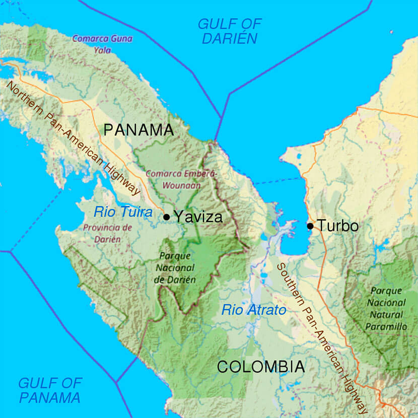 Первые планы строительства Панамериканского шоссе, которое соединяло бы Северную и Южную Америку, были приняты еще в 1925 году. Учитывая протяженность магистралей, крошечный отрезок около 160 километров, соединяющий панамскую Явису с колумбийским городом Турбо, оказался непреодолимым для автодорожных инженеров. Этот пейзаж до сих пор представляет собой непроходимые джунгли с такой высокой влажностью, что любые кожаные изделия, будь то ремни или обувь, приходят в полную негодность всего за несколько дней.