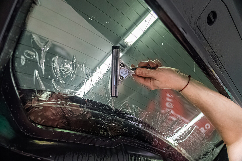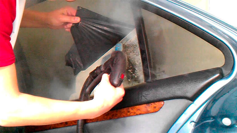 Здесь важно не перегреть тонировку, соблюдая температуру до 40°С, иначе она расплавится и расползется тягучими кляксами по стеклу. Чтобы не запачкать и не повредить внутренний декор дверных карт и резиновые уплотнители, их лучше предварительно чем-то закрыть или демонтировать.