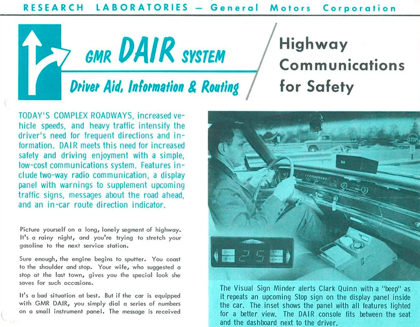 И хотя система DAIR не ушла в массовое производство из-за плохой масштабируемости, такие ее принципы, как позиционирование с помощью маяков и связь со спецслужбами, предложенные инженерами General Motors, впоследствии были использованы в современных навигаторах.