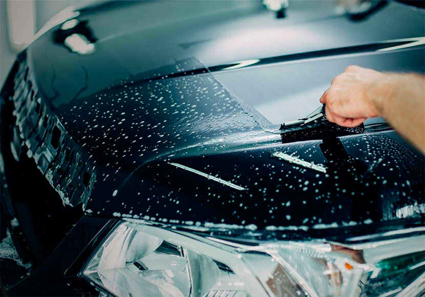 Данное покрытие в народе называют «бронепленкой», и не зря. Ее нанесение добавляет кузову 150 микрон толщины. Она тоже царапается, но восстанавливается полировкой, а не вторичным нанесением слоя. Премиальная пленка (здесь говорим только о качественных материалах, так как бюджетные аналоги принесут больше вреда) выдерживает пескоструй на скорости до 140 км/ч.