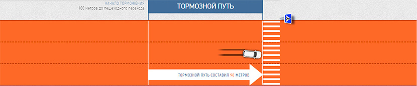 Если на сухом асфальте тормозной путь при остановке за 100 метров до пешеходного перехода составит лишь 14 метров, то на мокрой дороге он увеличится до 25 метров, на снегу – до 49 метров, а на льду составит уже 98 метров (то есть у самой ограничительной черты). А если скорость транспортного средства будет превышать 70 км/ч, тормозной путь увеличится минимум на треть, то есть начинать торможение надо за 200 метров.