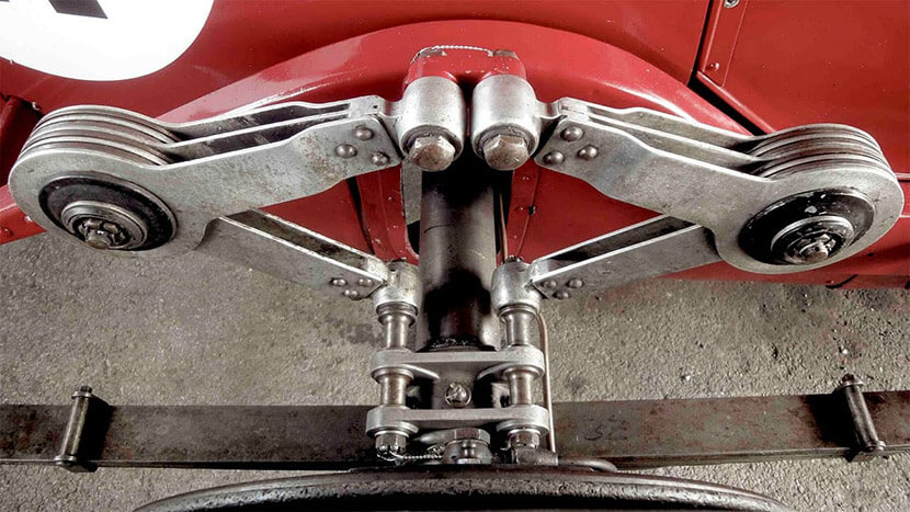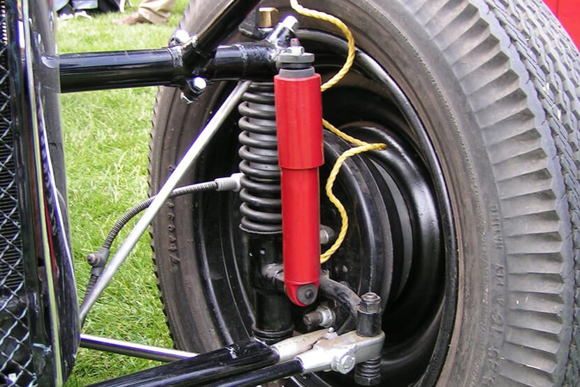Что касается гидравлических амортизаторов, то конструктивно они напоминали современные телескопические. Они представляли собой цилиндрический корпус, заполненный маслом, внутри которого на специальном стержне вращалось колесо с четырьмя лопастями, на каждой из которых были проделаны разнокалиберные отверстия (позже их дополнили клапанами). При повороте этого стержня отверстия создавали сопротивление жидкости, благодаря чему и возникало демпфирование. Сам корпус амортизатора был крепился к раме авто и был неподвижен. Рычаг надевался на выходящую из него ось, которая уже и крепилась к остальной подвеске. Регулировка этого рычага позволяла изменять жесткость амортизатора.