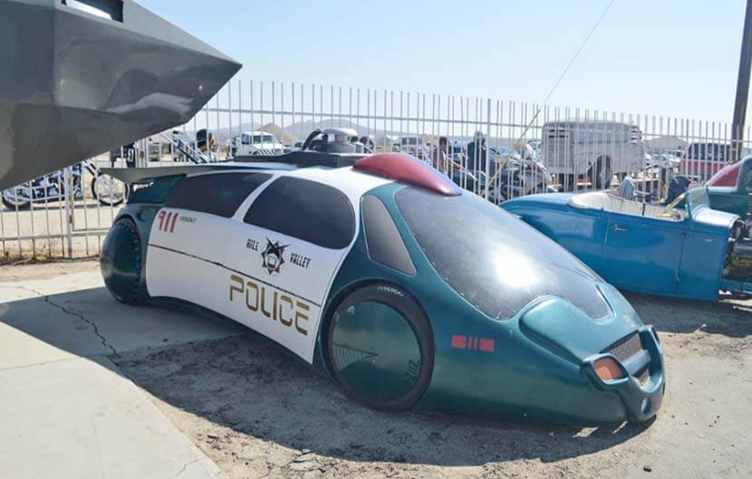 • футуристический полицейский автомобиль из сцены «2015 года» в «Назад в будущее 2» (1989), разработанный специально для фильма иллюстратором и концепт-художником Тимом Флэттери в виде совершенно гладкой, обтекаемой капсулы без дверных ручек, зеркал и прочих выступающих атрибутов стандартного авто.