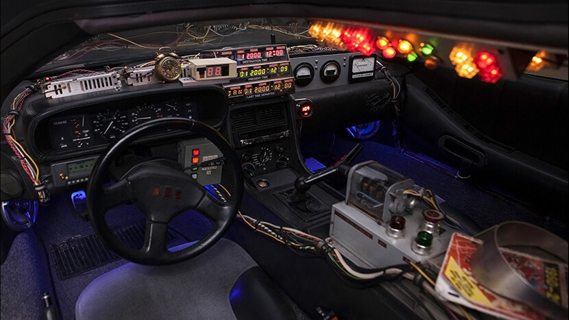 Так, главными интерьерными особенностями съемочного DMC-12 стали конденсатор потока (ящик со светящимися трубками в виде литеры «Y») и временной контур (устройство ввода с цифровым дисплеем). По сценарной концепции, чтобы пронзить пространственно-временной континуум, машина времени должна была разогнаться до 88 миль в час (около 140 км/ч), тогда как фактически максимальная скорость заводского DeLorean достигала лишь 85 миль в час, поэтому бутафорам картины пришлось изготовить отдельный спидометр.