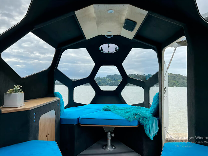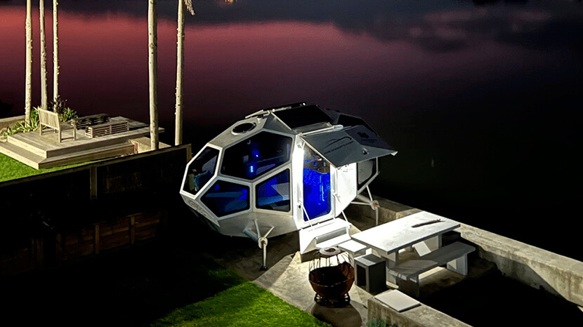 Кстати, видом транспорта для перевозки P.O.D. может быть не только автомобиль, но и вертолет – на этот случай в несущих частях корпуса геокупола предусмотрены проушины для крюков транспортных тросов. К слову, любители комфортной рыбалки могут заказать вариант с понтонным днищем и использовать капсулу как лодку. Правда, в самом крошечном своем исполнении она весит тонну, хотя и неясно, в какой комплектации и с каким снаряжением. И напоследок самое главное – стартовая цена этого чуда техники для защиты от всего на свете начинается с 98.000 новозеландских долларов.