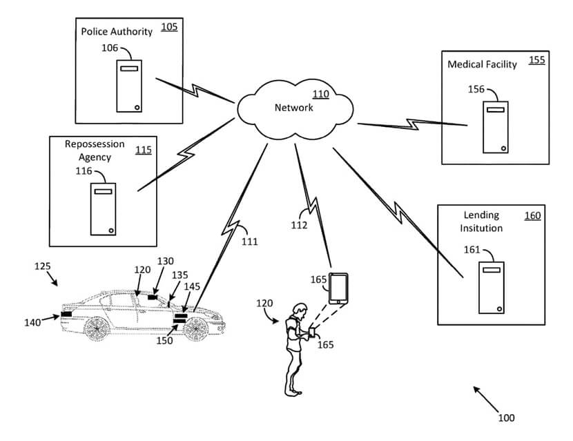 Как видно на схеме выше, автомобиль, имеющий патентованную прошивку Ford, способен передавать данные о своем местонахождении и нахождении владельца в медучреждение (155), полицию (105), организацию, возвращающую магазинам или пунктам проката вещи, изъятые у неплательщиков (115), или в кредитное учреждение. Кроме того, при необходимости автомобиль доставит своего владельца по каждому из адресов данных учреждений самостоятельно.