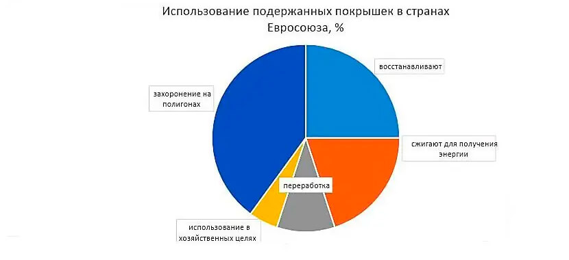 Пожалуй, самой вредным для экологии составляющей автомобиля являются покрышки. Отработавшей свое резиной заполняются мусорные полигоны на земле и океанические просторы, причем не только в РФ, но и в странах Европы. Причиной столь халатного отношения у утилизации резины является сложность в отделении металлического корда, да и сам процесс переработки изделий данного типа имеет низкую рентабельность. В среднем лишь 10% шин отправляется на переработку. Из них делают покрытия спортплощадок, маты, облицовочные покрытия для переездов через трамвайные и ж/д пути, конвейерные ленты, «лежачих полицейских», кровельные материалы и даже резиноасфальт.