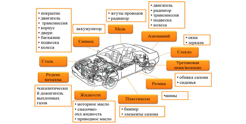 Правового вопроса об утилизации здесь касаться не будем – об этом можно прочитать отдельный материал. Здесь мы рассмотрим саму технологию переработки автомобиля. Итак, каждое легковое авто на 65-73% состоит из металла, 8-12% – из пластика, 3,5-6% – из резины, 2,5-2,8% – из стекла, 6-8% – из цветных металлов. Так же 2,5-6% в нем занимают технические жидкости и 6-8% – иные материалы. Все это тщательно отделяется, сортируется и подвергается вторичной переработке.