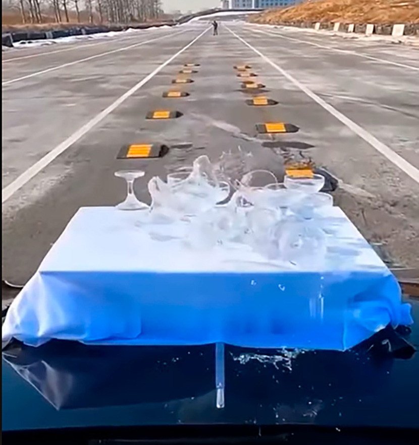 А вот китаец, как ни странно, оказался готов ко всему. Он не только не разбил ни одного бокала, но даже ни пролил из каждого ни капли! Создатели Nio ET9 утверждают, что подобной мягкости хода удалось добиться благодаря системе SkyRide, которой был оснащен данный седан. Китайские инженеры уверяют, что она является первой в мире полностью активной гидравлической подвеской с электрическим приводом.