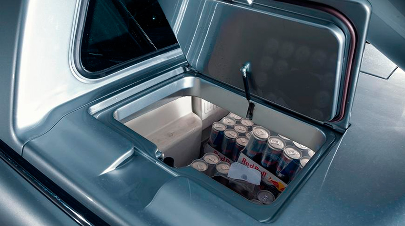 Мало кто знает, что огромная банка на корме Red Bull Car не единственная «фишка» данного авто. Также в его задней части, на месте бывшего заднего ряда сидений, установлен встроенный холодильник, места в котором хватает, чтобы перевезти 13 ящиков энергетического напитка. Доступ к столь ценному грузу выполняется через два откидных люка под бутафорской банкой. А панель управления холодильной установкой расположена на задней стенке кабины.