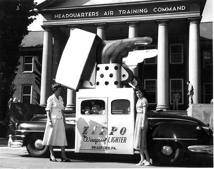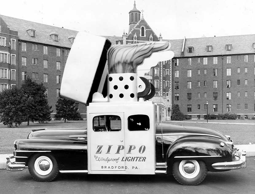 Помните самоходную банку мятных леденцов Pep-O-Mint Life Savers? Основатель известного бренда Zippo Джордж Грант Блэйсделл решил поступить схожим образом, выпуская свою продукцию в массы. Дело в том, что до Второй мировой его зажигалки гражданским лицам не отпускались, зато после окончания войны это ограничение было снято. Чтобы напомнить о Zippo людям, м-р Блэйсделл заказал особый автомобиль.