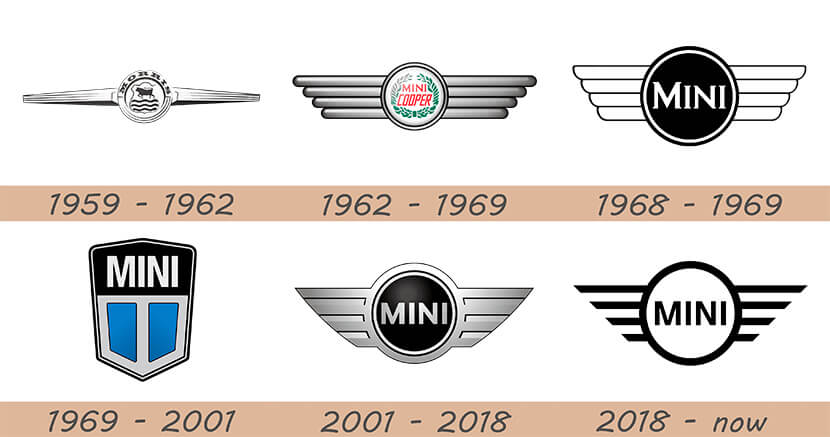 Название Mini в качестве самостоятельного производителя появилось в 1969 году. Ее предтечей стал выход на внутренний рынок городского авто Morris Mini-Minor в 1959-м и презентованной в 1960-х спортивной «зажигалки» Mini Cooper. Данный исторический период бренда ознаменован геральдическим щитом, как видно на фото.
