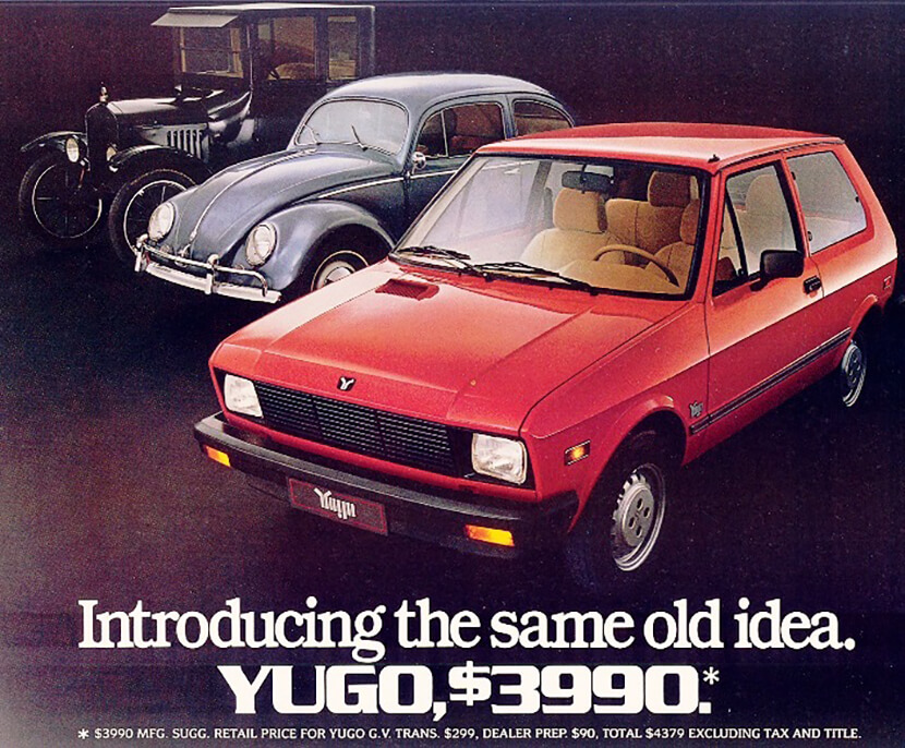 Такой подход к раскрутке югославской новинки сверхмалого класса взял на вооружение сам Бриклин, начав продвигать рекламу со слоганом: «У каждого бывают времена, когда нужен Yugo». Это сработало – к 1989 году в США было реализовано более 140 тысяч единиц данной модели.