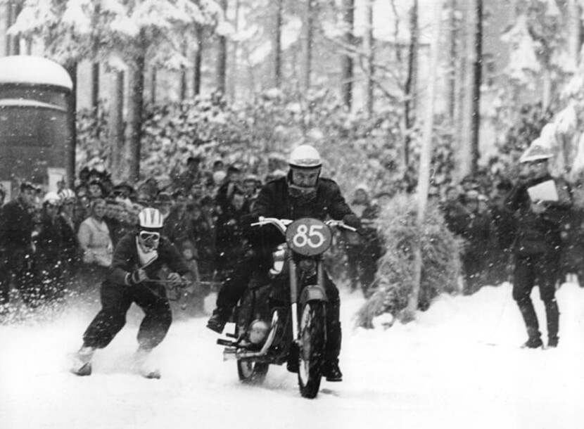 Первыми такую практику ввели гонщики из скандинавских стран. За ними подтянулись жители континентальной Европы, включая Венгрию, Германию, Прибалтику, Чехию, Словакию и Францию. Даже в СССР такой спорт практиковался! Чтобы понять, насколько все серьезно, достаточно посмотреть раритетные фото 1955 года, где лыжники закреплены за автомобилями Porsche. Впрочем, такой формат был выбран автопроизводителем для пиара своей продукции. В каноничном скийоринге используется мотоцикл с водителем и один лыжник.