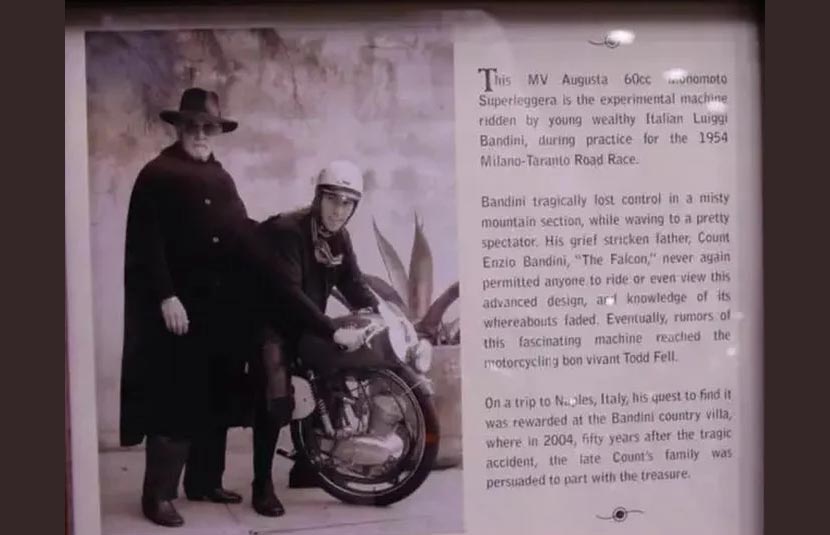 Известный гонщик Луиджи Бандини был впечатлен диковиной и даже решил выступать на ней в гонке Милан – Таранто. Удачные предварительные заезды лишь укрепили его намерения. К сожалению, во время гонки молодой пилот погиб, помахав рукой зрителям и потеряв равновесие. Его отец, граф Энцио Бандини, решил скрыть роковой моноцикл от мира, запретив кому-либо не только ездить на нем, но и изучать конструкцию. Тем не менее после смерти графа прототип был выкуплен у семейства Бандини и вывезен из родового поместья в Неаполе, после чего следы его затерялись.