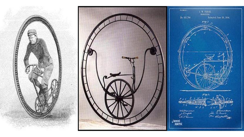 Годом позже американец Том Коутс Клинтон зарегистрировал патент моноцикла с установленным толкающим винтом. Транспорт представлял собой огромное колесо в человеческий рост, внутри которого размещались рама, мотор, платформа со стабилизирующими колесиками и сиденьем для пилота. Премьера чудного аппарата состоялась на Миланской выставке и сопровождалась серией громких публикаций в газете La Vie de l’Automobile. Данный моноцикл наделал поистине много шума, но заниматься его массовым производством никто не захотел – слишком диковинным моноцикл получился.