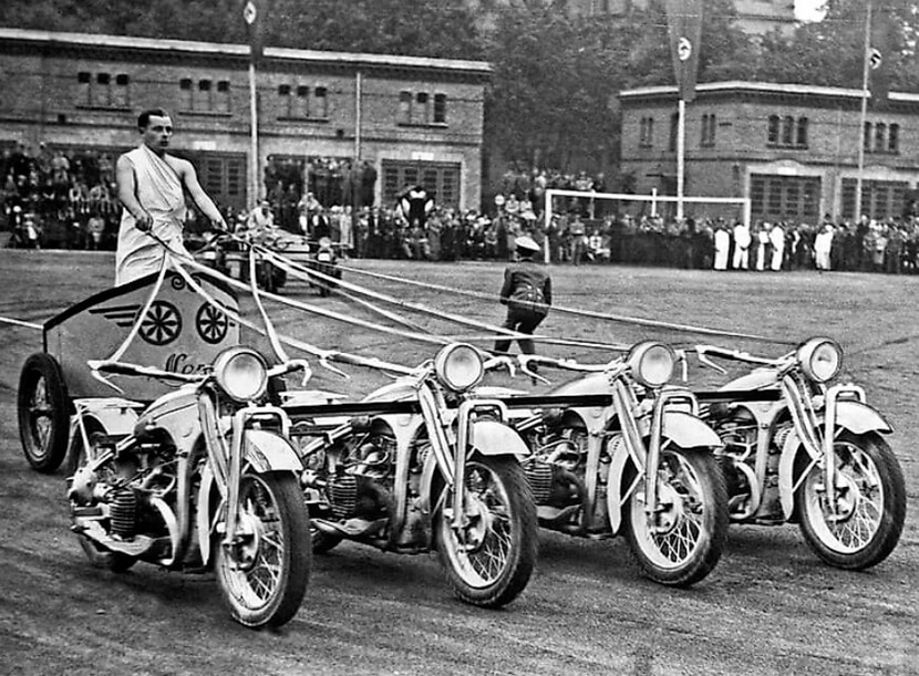 К примеру, на карнавале 1936 года в Сиднее пробег мотоколесниц стал главной сенсацией, хотя недостатка каскадёров и трюкачей на этом мероприятии не было. В то же время этот странный аттракцион перекочевал в Европу и США. Самым известным и зрелищным таким экипажем была настоящая квадрига — колесница, запряженная сразу четырьмя мотоциклами BMW R-75, чья суммарная мощность составила 104 «лошади». Выступала эта упряжка в Потсдаме на национальном спортивном празднике.