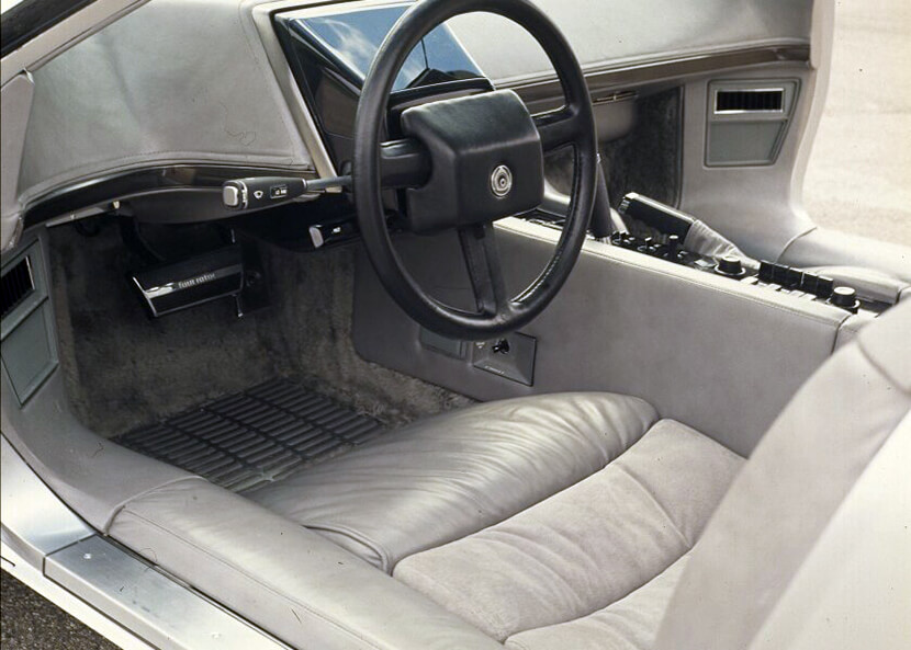 Дизайнер Билл Митчелл использовал в концепте V-образное стекло с углом наклона в 72⁰, которое даже забрало немного пространства у дверей, чтобы скрыть собой передние стойки. Двери, к слову, открывались по принципу «крылья чайки», но благодаря складной конструкции зависали высоко над крышей, обеспечивая удобную посадку водителю и пассажиру. В авто также были «слепые» фары с большой для оптики такого типа прямоугольной плоскостью, что обеспечивало отличный обзор в темное время суток без ущерба для аэродинамики.
