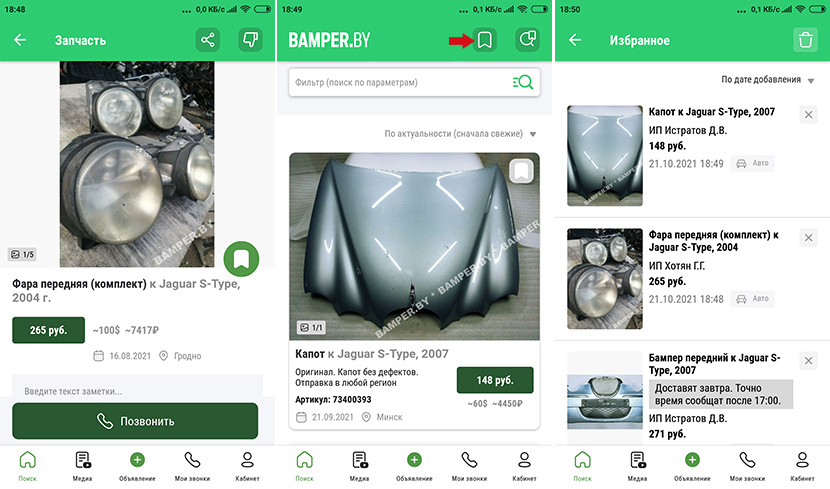 В этом разделе отображаются объявления, которые вас заинтересовали больше остальных. Название, марка, модель, год, заметка для себя, информация о продавце, цена – все это больше не надо держать в памяти, потому что наше приложение сделает это за вас.
