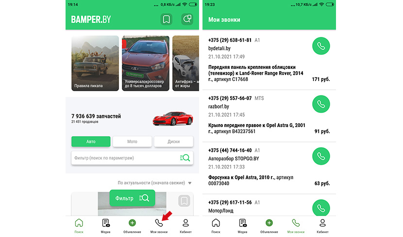 В этом разделе сохраняются все ваши звонки по интересующим вас объявлениям. Причем вы увидите не только номер абонента и точное время, когда вы ему звонили, но и название продавца (если это компания или индивидуальный предприниматель), а также основную информацию о запчасти. Так что при необходимости вам не надо будет заново искать нужный телефон – достаточно зайти в раздел «Мои звонки» и перезвонить абоненту.