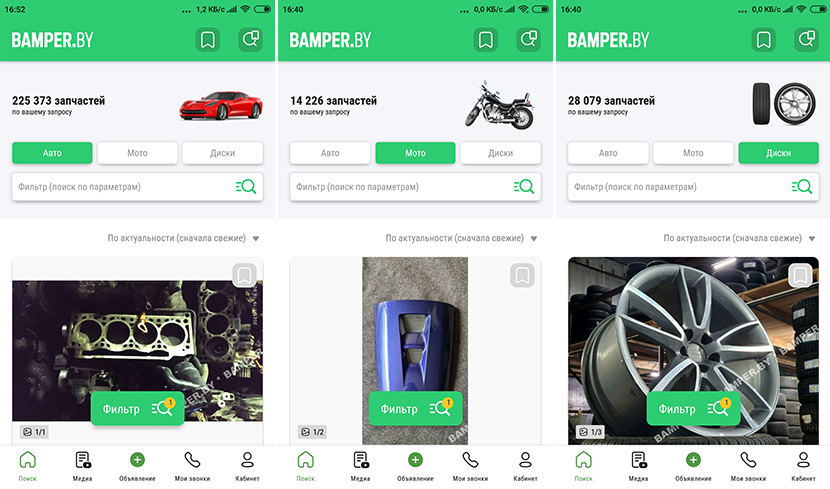 Кроме того, в версии 2.0 мы разбили базу объявлений, которая ранее была общей, на блоки «Авто», «Мото» и «Диски». Сделано это было для того, чтобы подчеркнуть особенности, присущие каждому из этих блоков. Получилось функционально и интуитивно понятно – именно то, чего ожидаешь от работы с приложением.