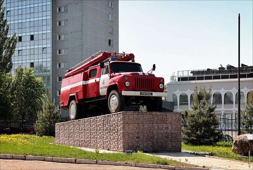 С другой стороны, она ведет прямиком в центр, но мы сначала свернем на Подлипаева, чтобы посмотреть на церковь Воскресения Христова. По дороге встречаем любопытную пожарную часть №4. Рядом в качестве памятника установлена автоцистерна АЦ-30(53А)-106А на базе ГАЗ-53, которые в советские времена были чуть ли на самыми распространенными машинами у пожарных.