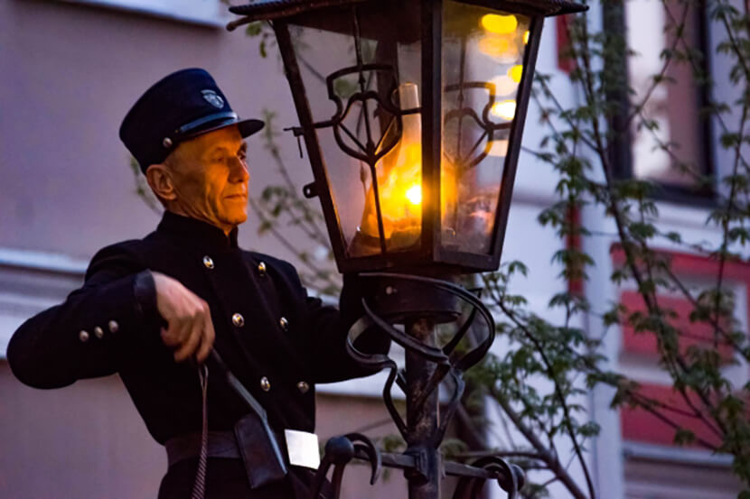 Фонари с горящими внутри керосиновыми лампами появились в Бресте в XIX веке. Со временем их заменили на спиртовые, которые тоже зажигают и гасят вручную. Существует поверье: если потереть пуговицу на костюме фонарщика и загадать желание, оно обязательно сбудется.