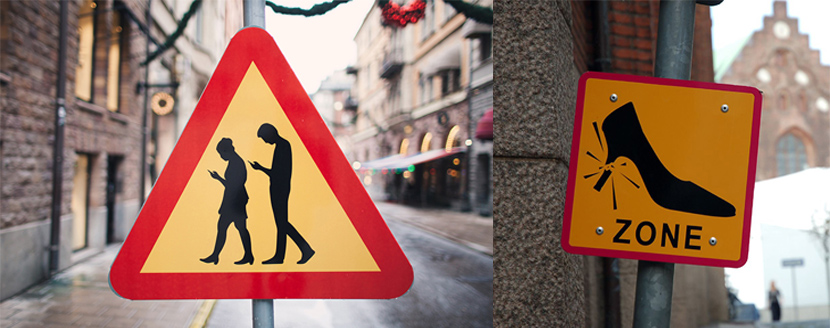 Едем дальше. Вернее, медленно идем, как и люди, привыкшие неотрывно смотреть на экраны своих смартфонов и планшетов, даже переходя проезжую часть. Уверен, многие из нас задавались вопросом, что же такое важное постигает пешеход, уткнувшись в экран своего мобильного устройства, переходя дорогу. К примеру, власти Швеции решили побеспокоиться о безопасности невнимательных пешеходов заранее, установив на дорогах соответствующее обозначение. Кстати, в европейских городах, особенно в исторических центрах, мощенных брусчаткой, встречается дорожный знак, понятный всякой моднице. Он предупреждает женщин на каблуках о том, что те могут повредить свою нетуристическую обувь.