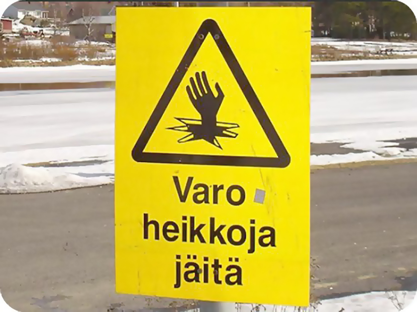 Данный знак, характерный для Финляндии, предупреждает не только водителей, но и пешеходов об опасности тонкого льда. Любопытно, что это обозначение даже не числится в списке дорожной администрации, хотя очень распространено и узнаваемо среди жителей страны. Да и тревожный посыл, отображенный в соответствующем изображении, явно не останется незамеченным.