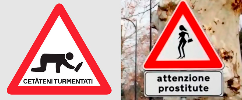А теперь повысим градус. В городах Германии, Румынии и Таиланда вблизи различных питейных заведений размещают знаки с изображением нетрезвых пешеходов, перед которыми автомобилисты должны снизить скорость и еще внимательнее смотреть по сторонам. Местные власти приняли такое решение в ответ на неутешительные результаты статистики, так как по вине подвыпивших людей ежегодно происходит большое количество ДТП. Кроме того, с некоторых пор в той же Румынии и Италии (провинция Тревизо) узаконен дорожный знак «Внимание! Проститутки!», призывающий водителей быть более сконцентрированными.