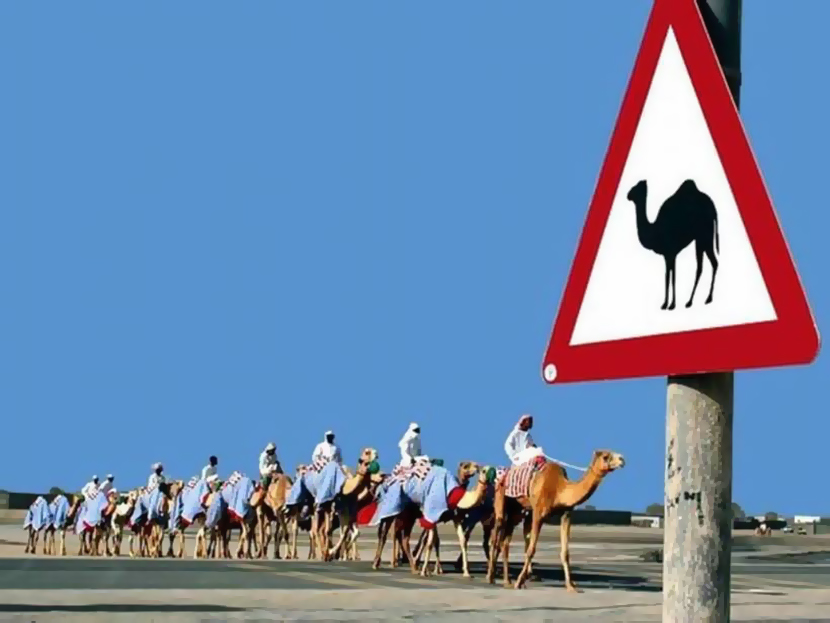И снова о животных, хотя уже в «комплекте» с человеком-наездником. Этот знак распространен в ОАЭ и буквально означает «Дорогу верблюдам». Его можно встретить даже на центральных улицах города, поскольку многие жители предпочитают четвероногий транспорт.