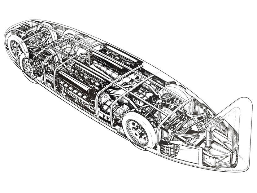 Чтобы достичь поставленной цели, изобретатели решили сделать силовую установку болида из двух 12-цилиндровых авиационных моторов Rolls-Royce Schneider. Объем каждого агрегата составлял 36,5 л, суммарная мощность – 4700 л.с.! Чтобы вместить все необходимые для такой установки функциональные узлы, длина «автомобиля» должна была быть не менее 10 метров, а снаряженная масса по предварительным расчетам – около 7 тонн…
