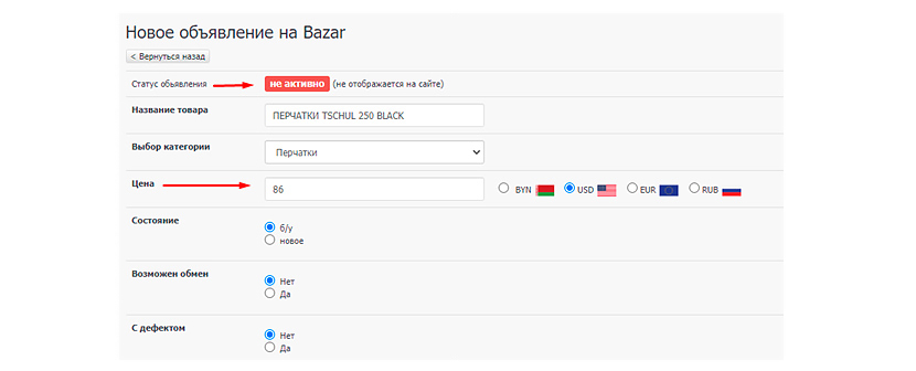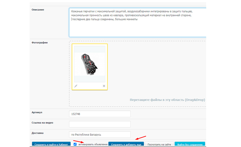 • Объявления могут быть активными и неактивными (они не видны покупателям). Ставя галочку, вы активируете объявления.