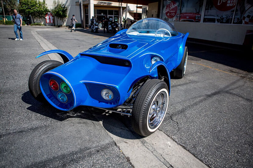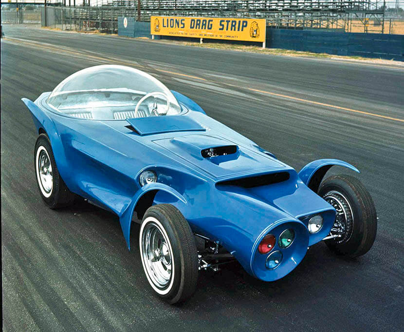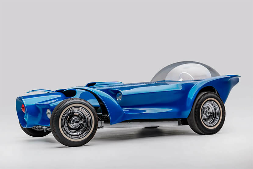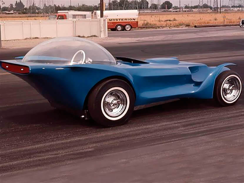 Корпус необычной машины, построенной в начале 1960-ых, был сделан в стиле ретро-футуризма и содержал в себе множество аэродинамических элементов, включая округлую кабину в виде самолетного фонаря из плексигласа, необычную оптику и диковинные крылья-лепестки, прикрывавшие колесные арки.