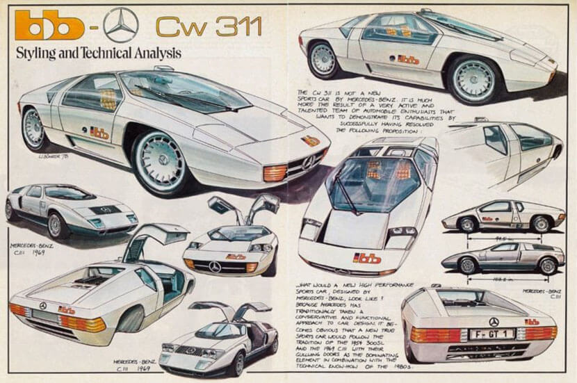 К слову, в проекте ВВ-Mercedes CW311 применялось множество деталей от Porsche, в частности: рулевое управление, замок зажигания и спидометр – от модели 911, подвеска и часть деталей салона – от 928. Любопытно, что в названии концепта лежит коэффициент аэродинамического сопротивления Cw 0,311, что даже сегодня является удивительным показателем.