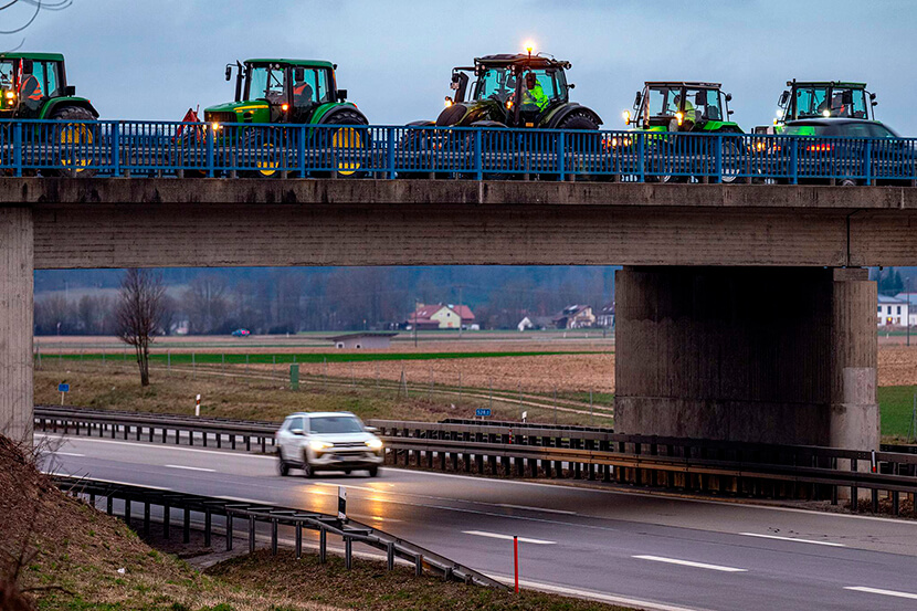 Со второй половины декабря 2023 года, а именно с 18-го числа, немецкие фермеры бастуют по всей стране: они проводят массовые митинги в различных населенных пунктах, а также блокируют движение и въезды на шоссе своей техникой, что вызвало серьезные затруднения в перемещении транспорта.