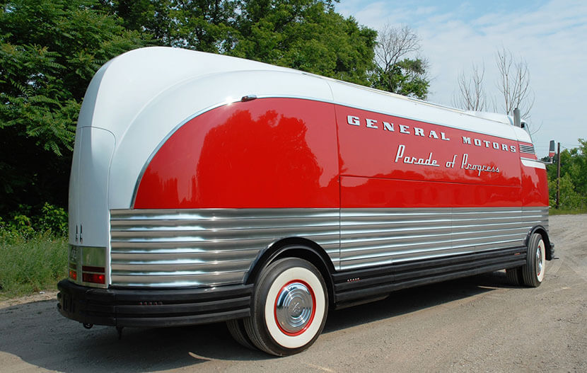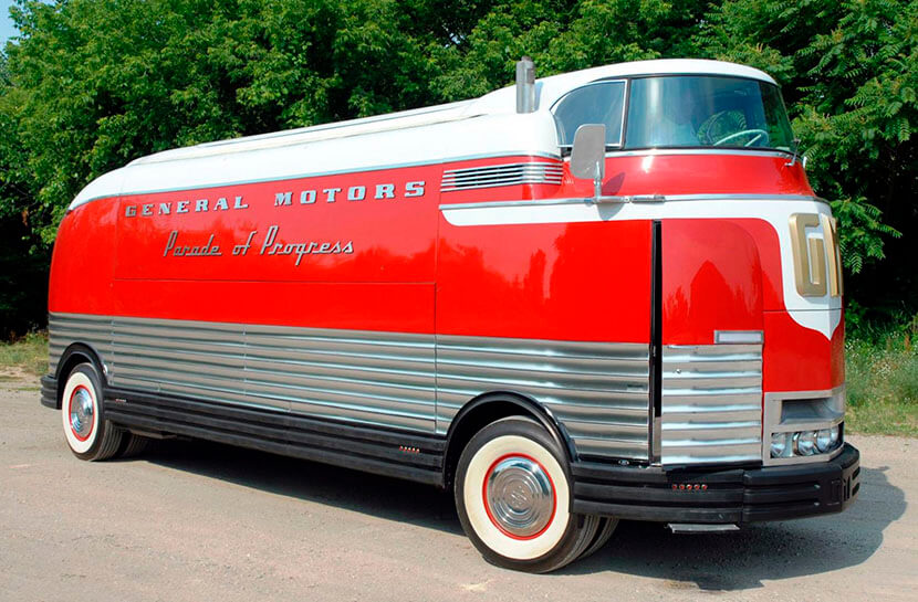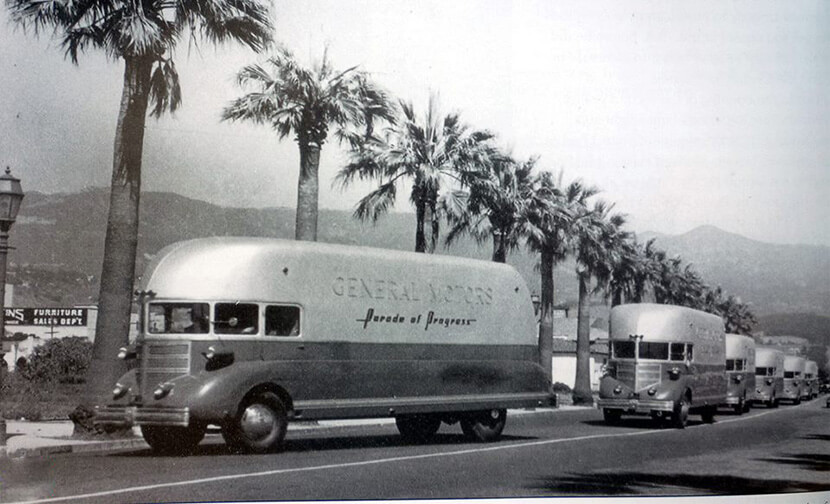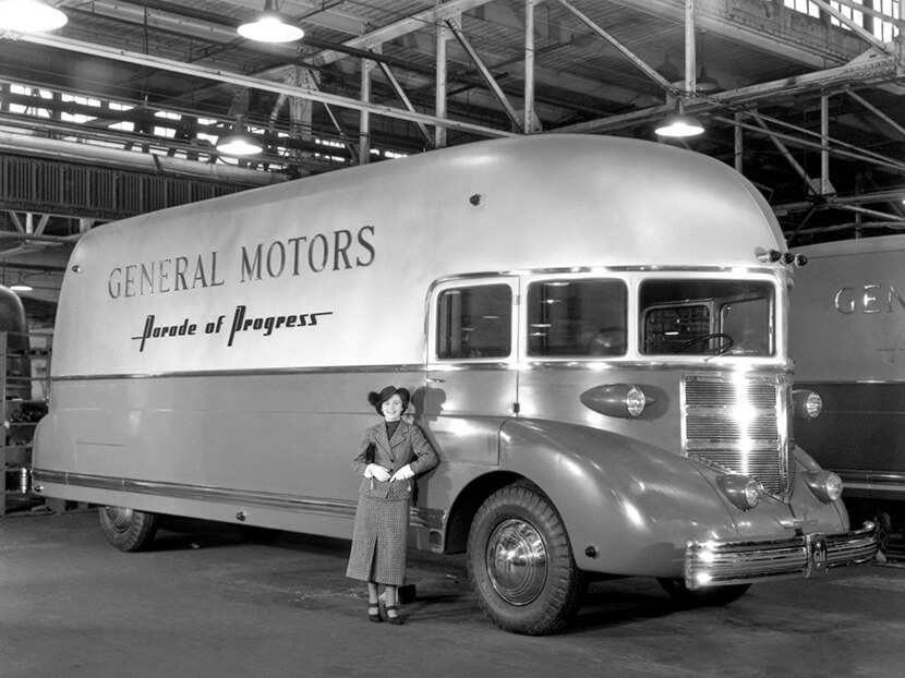 Для этой цели инженерный отдел General Motors спроектировал восемь необычных автобусов с интегрированными внутри витринами, которые были заполнены различными «штуками» вроде восьмицилиндровых двигателей, коробок передач и даже автомобилей в сборе для демонстрации публике. Эту передвижную колонну назвали Парадом прогресса. Где бы она ни появлялась, везде собирала вокруг себя толпы любопытных и жадных до хоть каких-нибудь развлечений «сельчан». До 1939 года ей удалось не только посетить каждый штат в родной стране, но и побывать в Мексике и даже на Кубе.